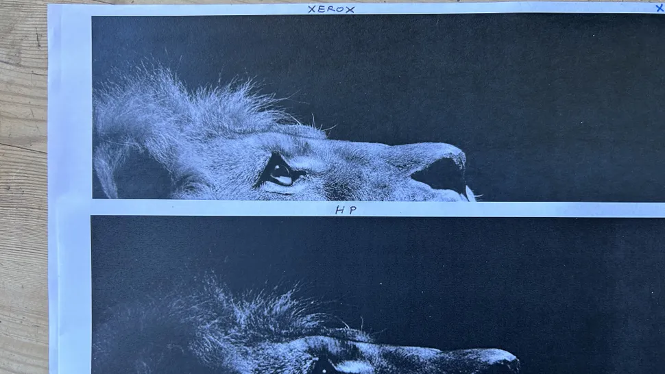 Принтер HP LaserJet M209dw не очень хорошо подходит для печати графики и фотографий. И то, и другое выглядит слишком тёмным и с плохой контрастностью, как видно на сравнении фотографий, где принтер Xerox показывает, как должен выглядеть лев.
