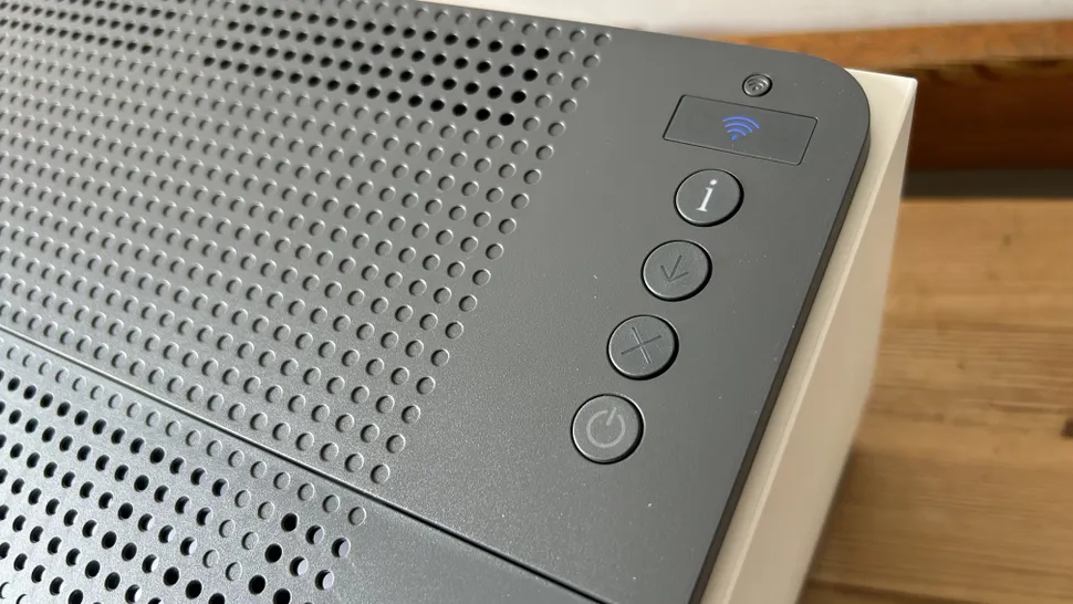 Здесь нет ни сканера, ни сенсорного дисплея, только один вход для бумаги, так что это минималистичный и лаконичный дизайн. Кнопки расположены сверху, а яркая светодиодная полоса на передней панели показывает, что принтер включён и подключён к Wi-Fi. Когда он подключён к сети, цвет меняется с фиолетового на синий.