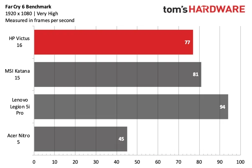 В Far Cry 6 (на очень высоких настройках) Katana 15 выдавал 81 кадр в секунду по сравнению с 77 кадрами в секунду у Victus 16. Опять же, ноутбуки с RTX 4050 опередили Nitro 5, а Legion Pro 5i показал преимущество в 13 кадров в секунду над Katana 15 благодаря более мощному графическому процессору RTX 4060.