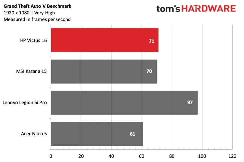 Grand Theft Auto V (очень высокие настройки) показала, что Victus 16 и Katana 15 идут ноздря в ноздрю, выдавая 71 и 70 кадров в секунду соответственно. Это на 10 кадров в секунду больше, чем у Nitro 5, а Legion 5i Pro значительно опережает их, выдавая почти 100 кадров в секунду.