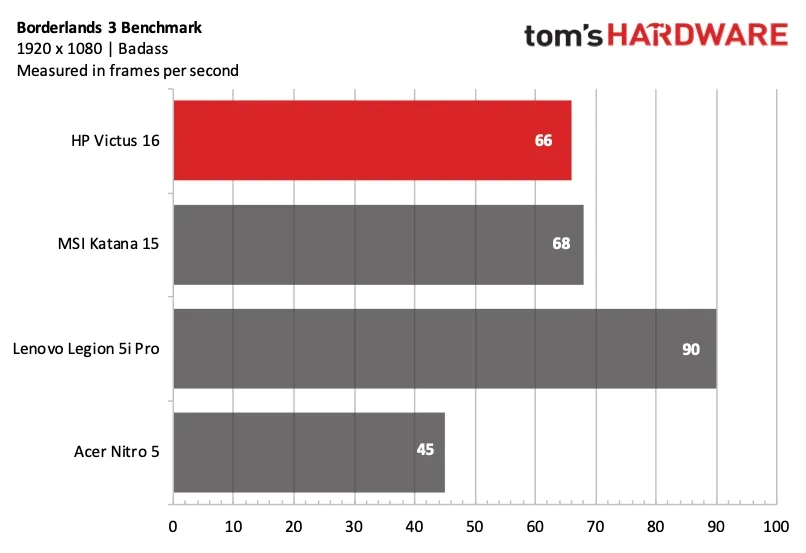 Borderlands 3 (с крутыми настройками) снова продемонстрировала напряжённую гонку между Victus 16 (66 кадров в секунду) и Katana 15 (68 кадров в секунду), в то время как Nitro 5 (45 кадров в секунду) и Legion 5i Pro (90 кадров в секунду) заняли свои обычные позиции в качестве крайних значений в этом сравнительном тесте.