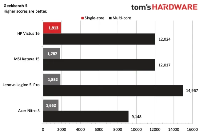 Начнём с синтетического теста процессора Geekbench 5. Victus 16 набрал 1913 и 12 024 балла в одноядерном и многоядерном тестах соответственно. Katana 15 с процессором Core i7-13620H не сильно отстаёт: 1787 и 12 017 баллов соответственно.