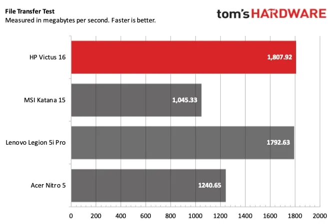 Переходя к тесту на передачу файлов, который включал копирование 25 ГБ данных, Victus 16 превзошёл всех соперников, показав скорость 1807,92 МБ/с. Legion 5i Pro был следующим по скорости — 1792,63 МБ/с, а Katana 15 замыкал список с показателем 1045,33 МБ/с.