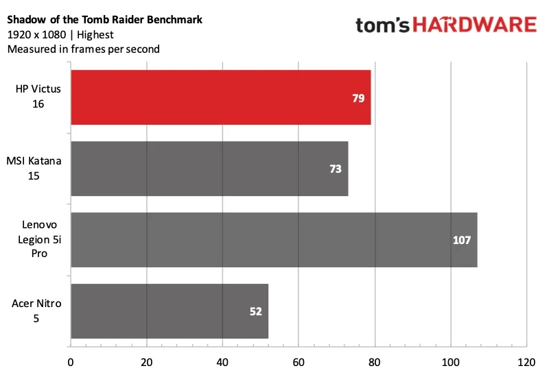 Victus 16 отлично справляется с Shadow of the Tomb Raider (на максимальных настройках), выдавая 79 кадров в секунду (fps) при разрешении 1080p. Katana 15 с менее производительным процессором Core i7-13260H не сильно отстаёт — 73 кадра в секунду. Машины с RTX 4050 заметно превосходят Nitro 5 с RTX 3050 Ti предыдущего поколения.