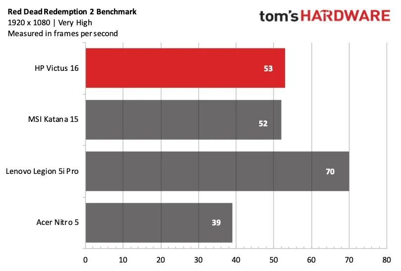 В Red Dead Redemption 2 (на очень высоких настройках) Victus 16 выдавал 53 кадра в секунду по сравнению с 52 кадрами в секунду у Katana 15. Эти два ноутбука практически не отличаются по производительности в играх при разрешении 1080p.