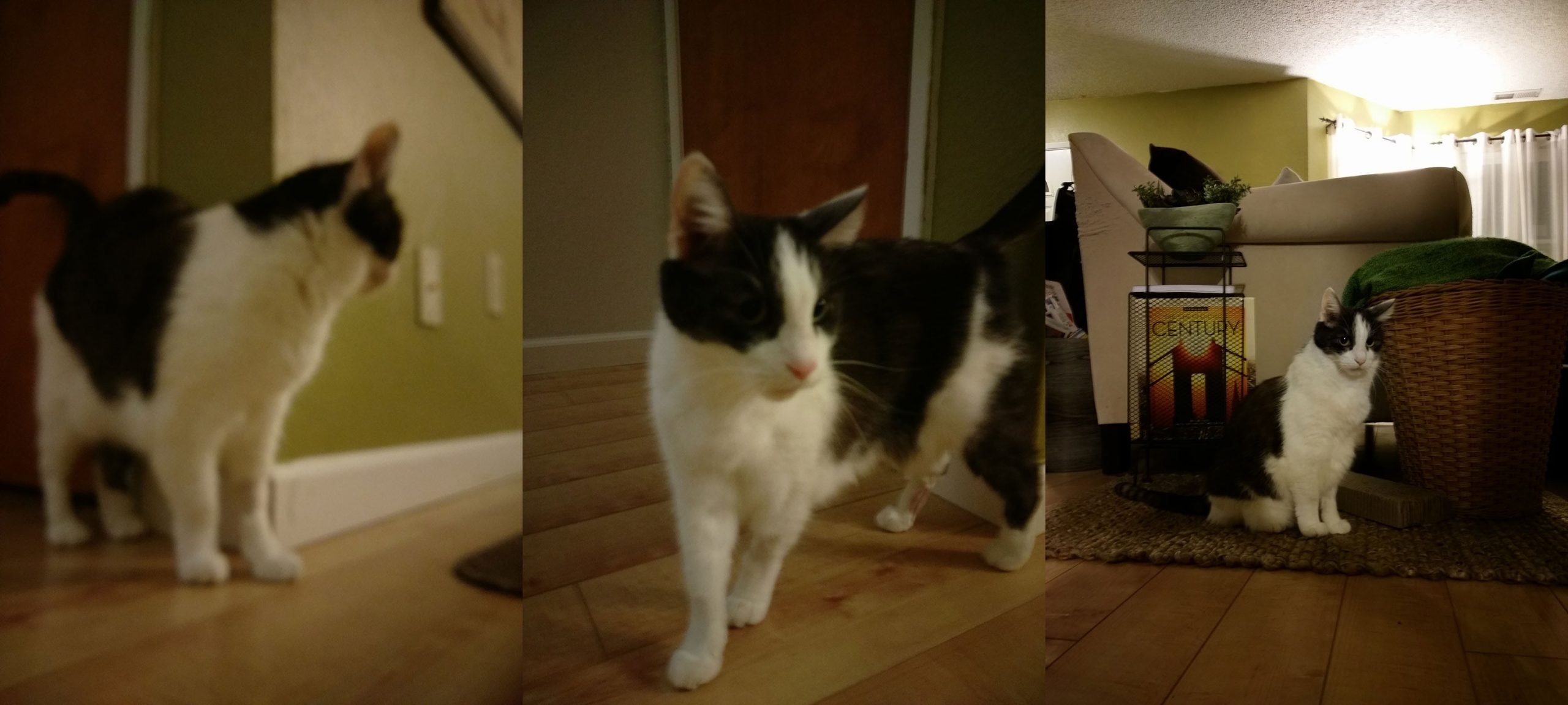 Мы пробовали метод «нажать и снять», и первые две фотографии получились размытыми. Третье, наилучшее фото, было снято, когда кошка ненамного замерла, и у нас появилось чуть больше времени на фокусировку