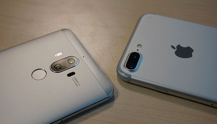 У Huawei Mate 9 весьма стильный дизайн, аппарат не выглядит громоздким и совершенно гармоничен по соседству с iPhone 7 Plus. Корпус естественно металлический, сканер отпечатков пальцев и сдвоенная камера производства Leica, как и P9, в наличии.