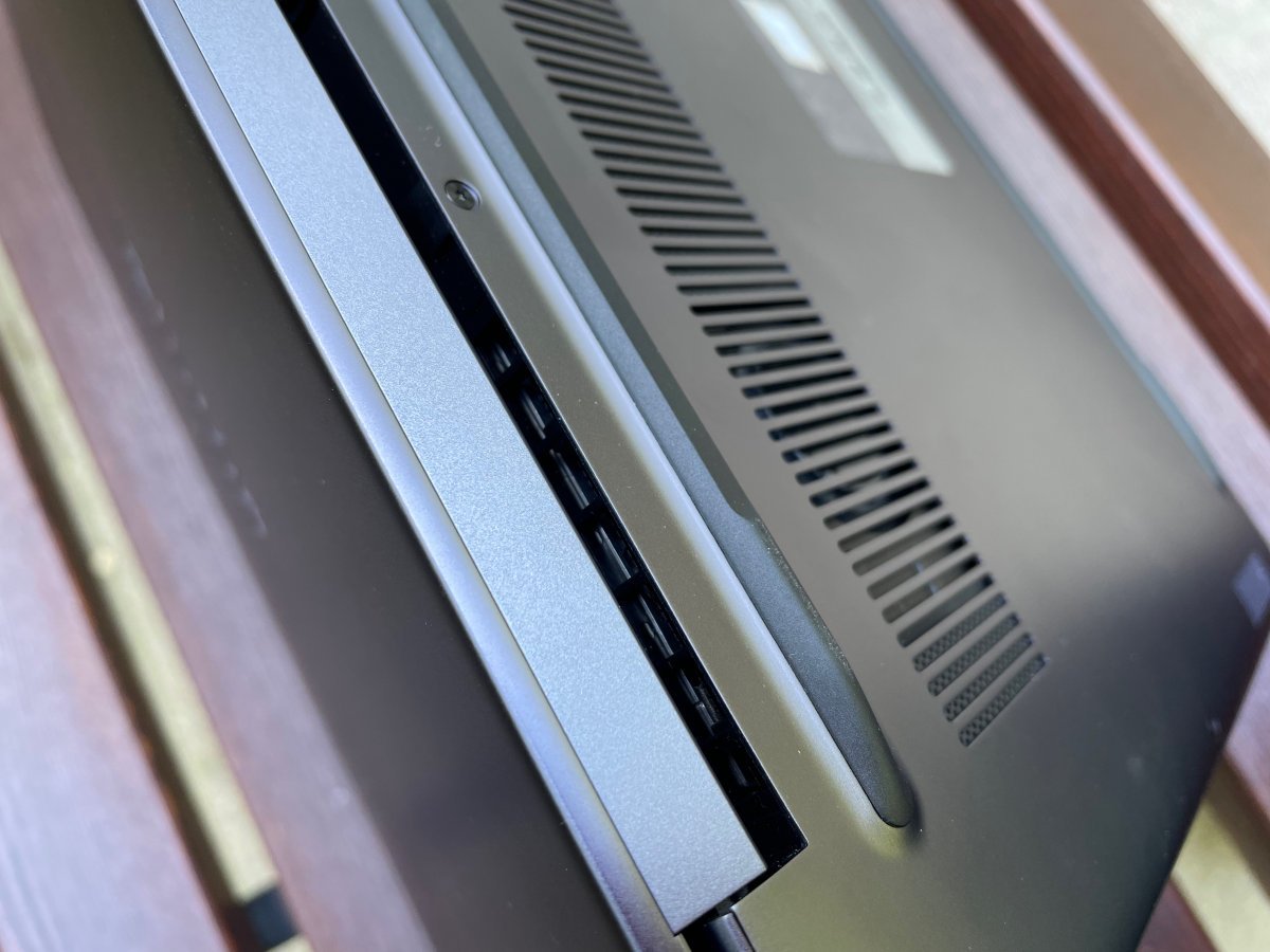 Вне зависимости от угла открытия экрана основание опирается на поверхность через две резиновые подставки, Это облегчает доступ воздуха к двум вентиляторам активной системы охлаждения. Разогретый воздушный поток через торец основания выходит в сторону монитора.