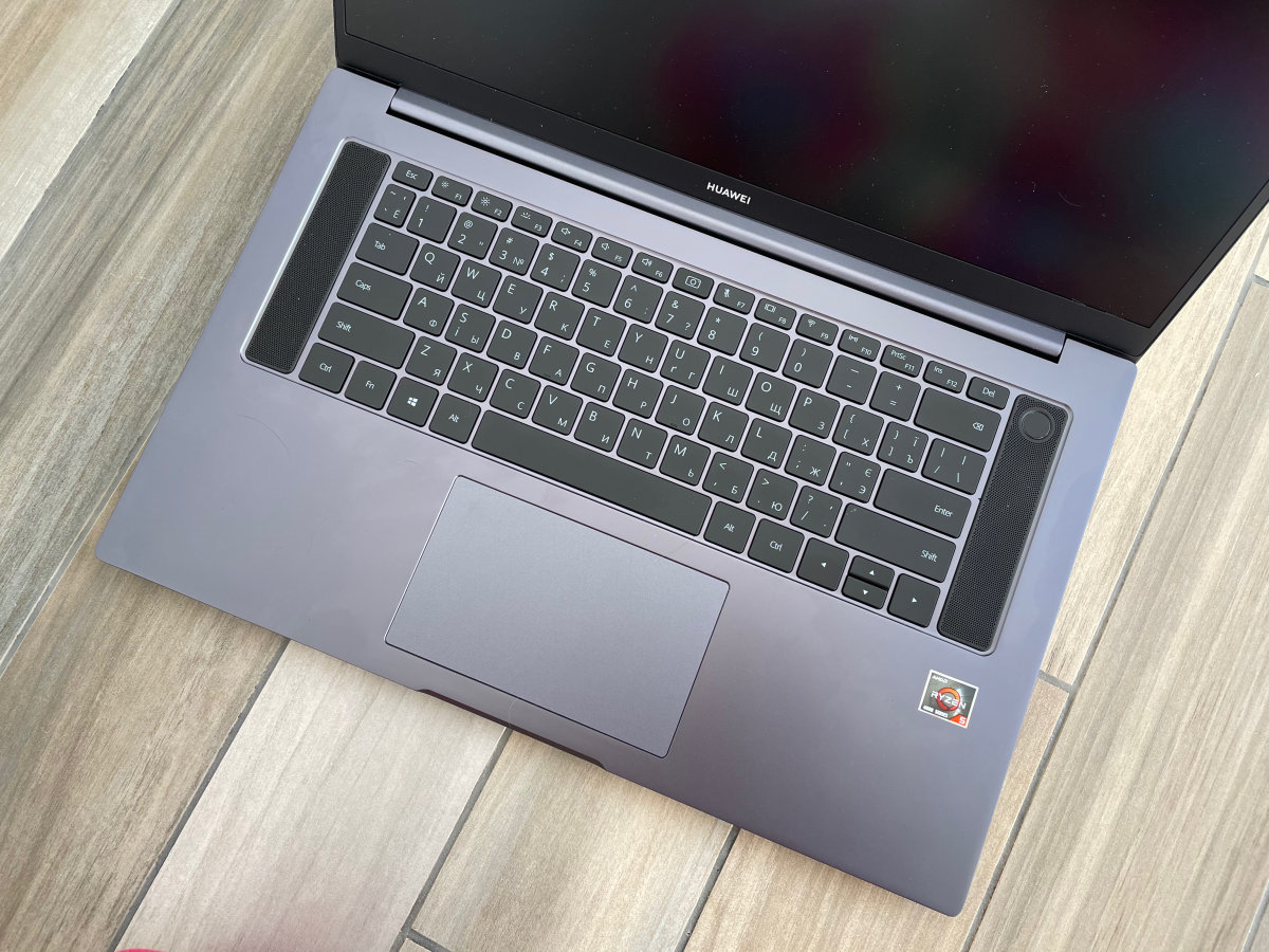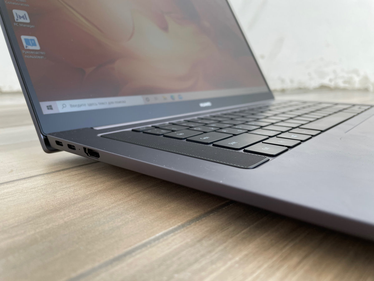 Но кое с чем придется смириться. При такой толщине рамок в верхней снова не нашлось места фронтальной камере, так что она, как и в других ноутбуках Huawei, вмонтирована в центральную функциональную клавишу и открывается по нажатию. С одной стороны, это исключает несанкционированное подглядывание за владельцем. С другой — общаться по видеосвязи с такой не очень удобно: ракурс лица получается странный, а при наборе текста собеседник будет наблюдать ваши пальцы крупным планом.