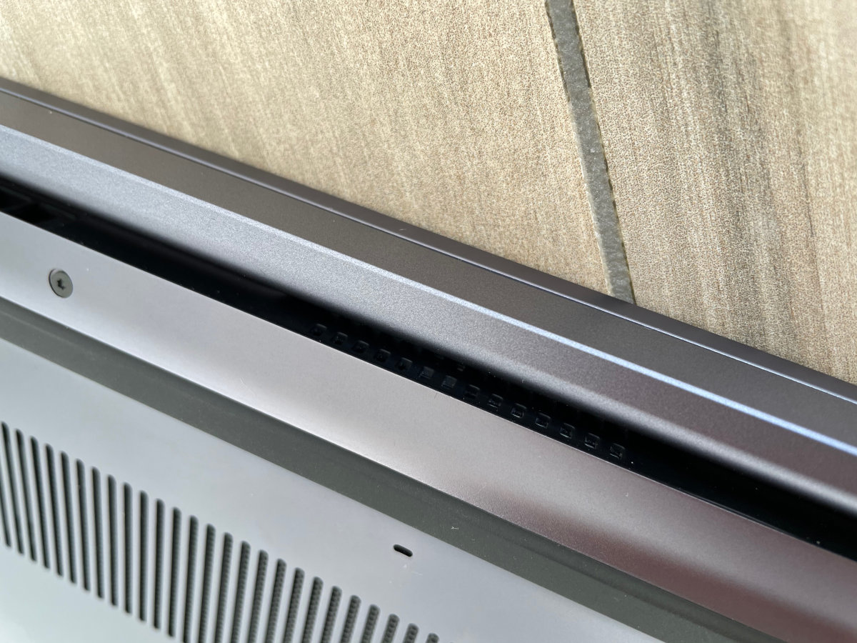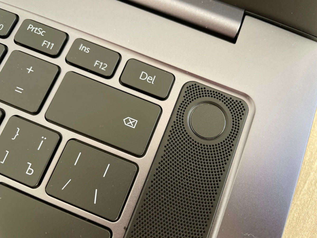 Слева и справа от клавиатуры разместились динамики аудиосистемы. В правый динамик интегрирована кнопка включения питания с дактилоскопическим сканером, он срабатывает быстро и точно.
