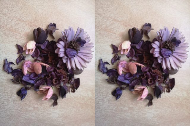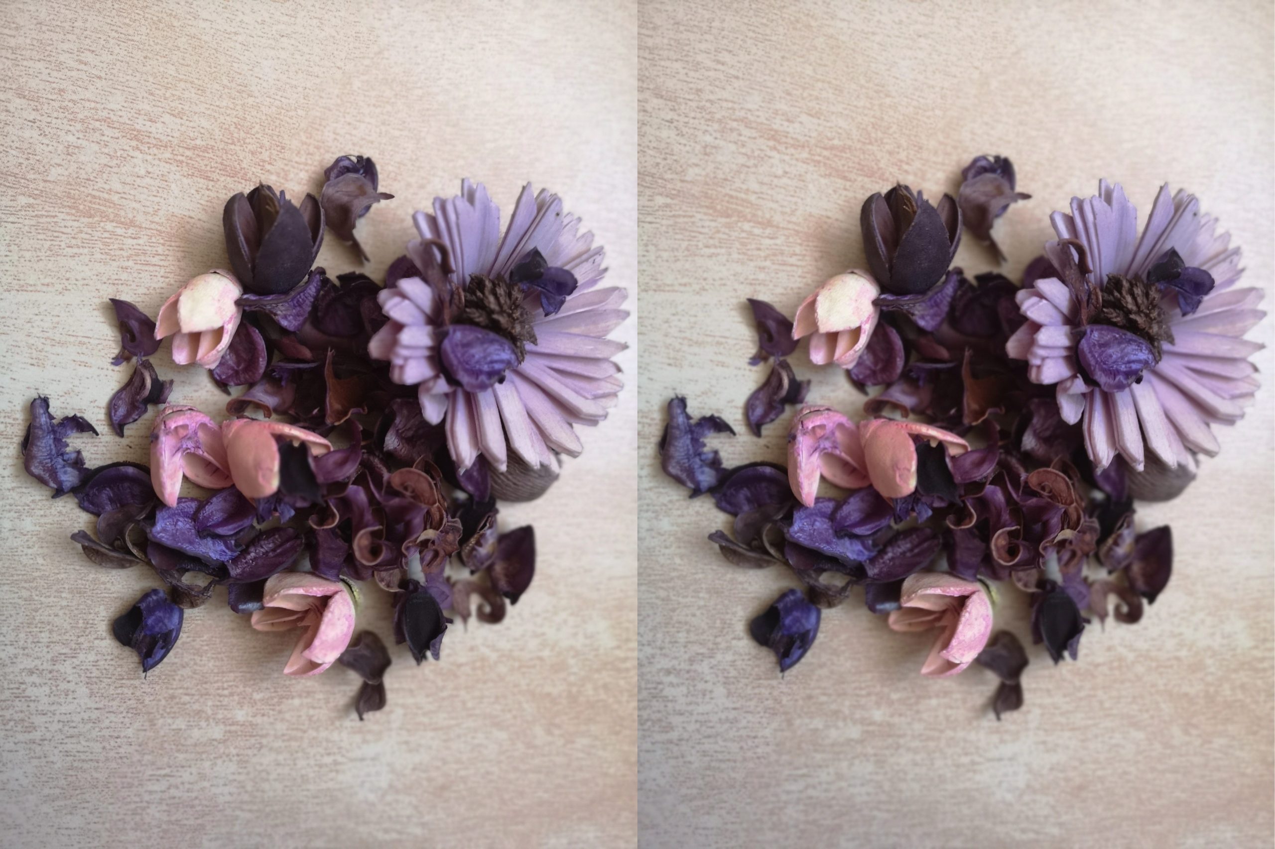 Слева фокус сделан на розовом цветке внизу, справа — перенесен на уже готовом снимке на большой фиолетовый цветок