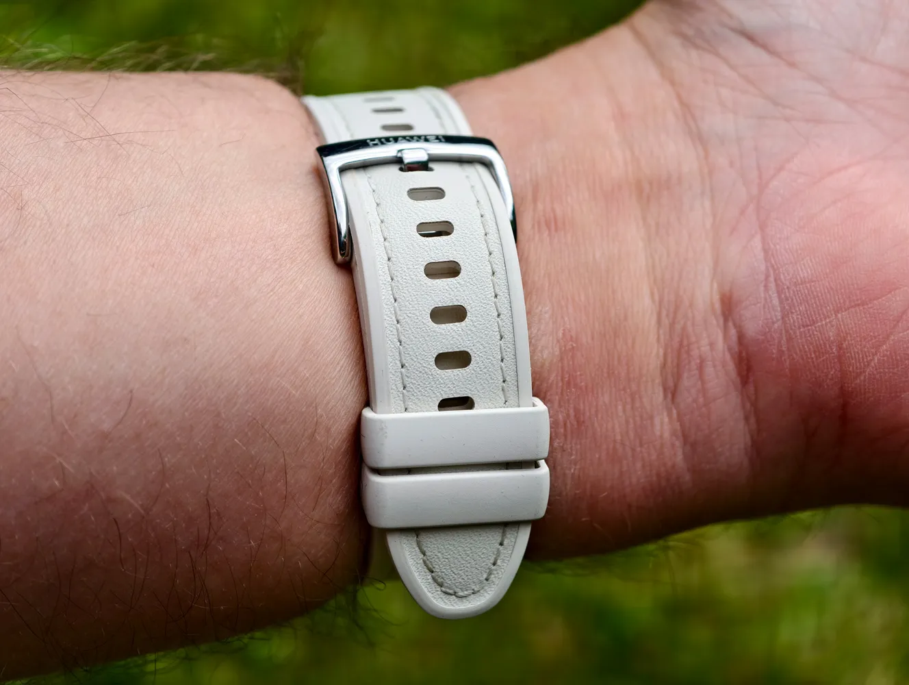 Мой 42-миллиметровый экземпляр имел более нейтральный с гендерной точки зрения корпус из нержавеющей стали 316L и белый ремешок из фторэластомера (то есть каучука) с эффектом кожи. Он был удобен как для занятий спортом, так и для повседневного ношения. Благодаря быстросъемным ушкам можно легко заменить стандартный ремешок на сторонний или браслет.