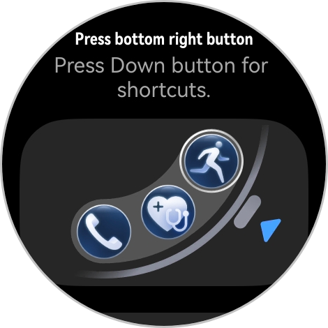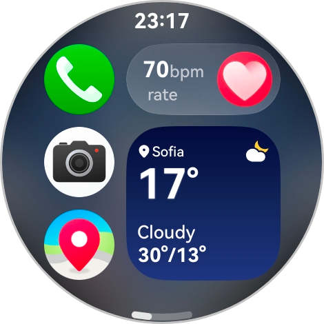 В правом нижнем углу находятся ярлыки для быстрого доступа к трём функциям/приложениям по вашему выбору (например, журнал вызовов, проверка состояния здоровья, тренировки), а в левом верхнем углу можно запрограммировать запуск режима погружения, экспедиции или игры в гольф, а также компаса, барометра или фонарика.