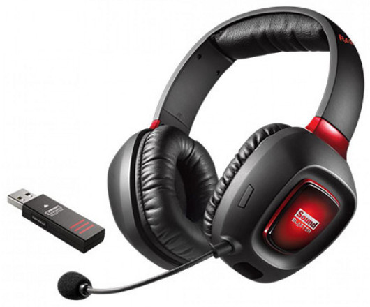 Данная модель является беспроводной гарнитурой, также ориентированной на любителей игр. Функционирует она на частоте 2,4 ГГц, при этом, по нашим измерениям, приемлемое качество сигнала обеспечивается на расстоянии до 10 м от передатчика. Последний по виду напоминает флешку довольно большого размера и подключается к USB-разъему ПК. Неплохо поработал производитель и над внешним видом наушников — они выглядят привлекательно и, пожалуй, даже немного агрессивно. Все элементы управления, а также микрофон выведены на левый наушник, но заметного перекоса по массе не возникает.