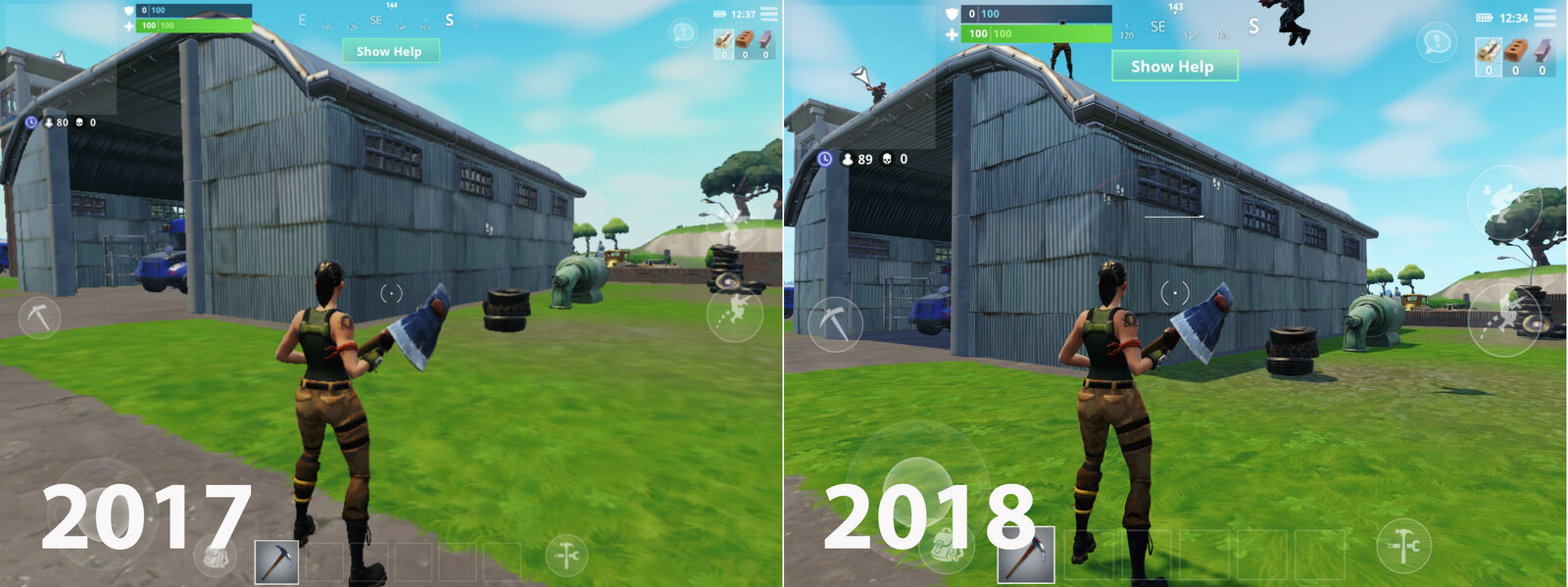 Fortnite на 9,7-дюймовом iPad 2017 года (слева) и на iPad 2018 года. На более старом планшете видна значительно более грубая пикселизация.