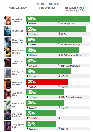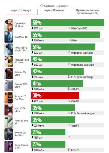 Apple обещает, что iPhone 17 Pro Max будет заряжаться до 50 % за 20 минут при использовании нового адаптера, хотя не исключает, что другие адаптеры могут обеспечить такой же результат. «До 50 % заряда за 20 минут при использовании адаптера мощностью 40 Вт или выше (приобретается отдельно) в сочетании с кабелем для зарядки USB-C», — говорится в официальных характеристиках.