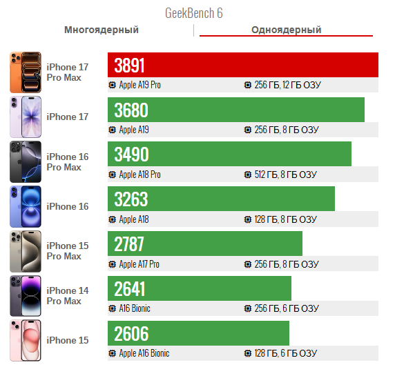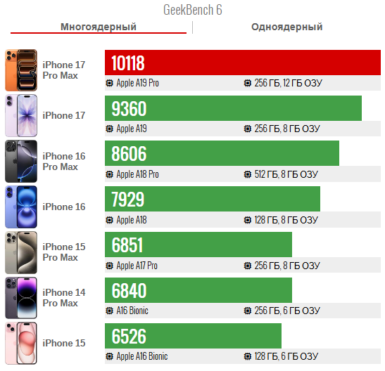 Результаты AnTuTu у iPhone 17 Pro Max ещё более впечатляющие: совокупный балл намного выше, чем у iPhone 15 Pro Max, и намного лучше, чем у iPhone 16 Pro Max.