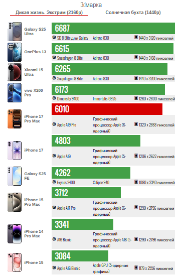 По результатам теста 3D Mark графическая производительность iPhone 17 Pro Max сравнима с производительностью последних моделей Android-смартфонов топового уровня, но при этом он занимает первое место по трассировке лучей.
