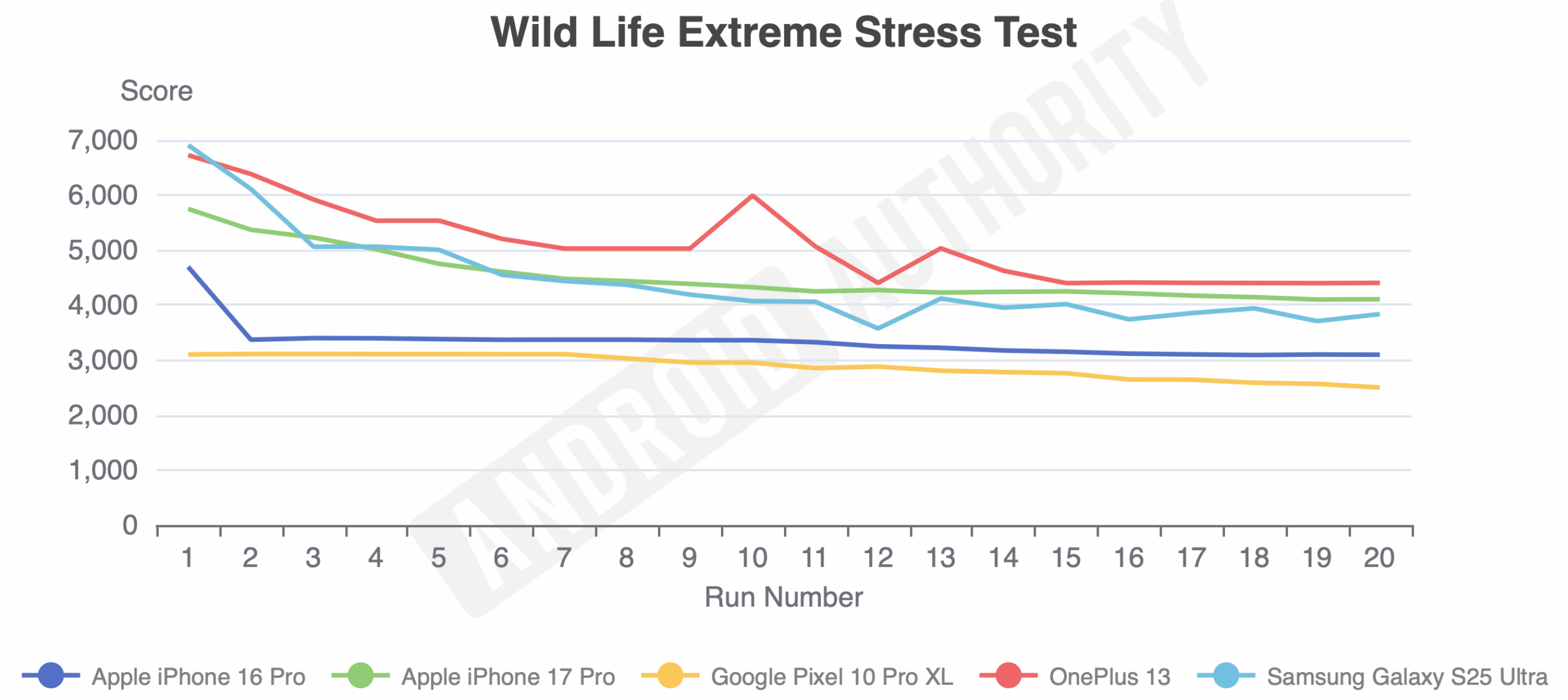 С самого начала кажется, что всё в порядке. Чипсет A19 Pro продолжает дело своего предшественника, доминируя в одноядерном тесте Geekbench 6 и не уступая Galaxy S25 Ultra в многоядерной производительности. Неудивительно, что он также превосходит обновлённый Tensor G5 от Google, который никогда не отличался высокими результатами в бенчмарках. iPhone 17 Pro продолжает успешно проходить тесты на графическом процессоре, завершая 20 тестов с небольшим отставанием от OnePlus 13, но показывая более стабильные результаты от начала и до конца.