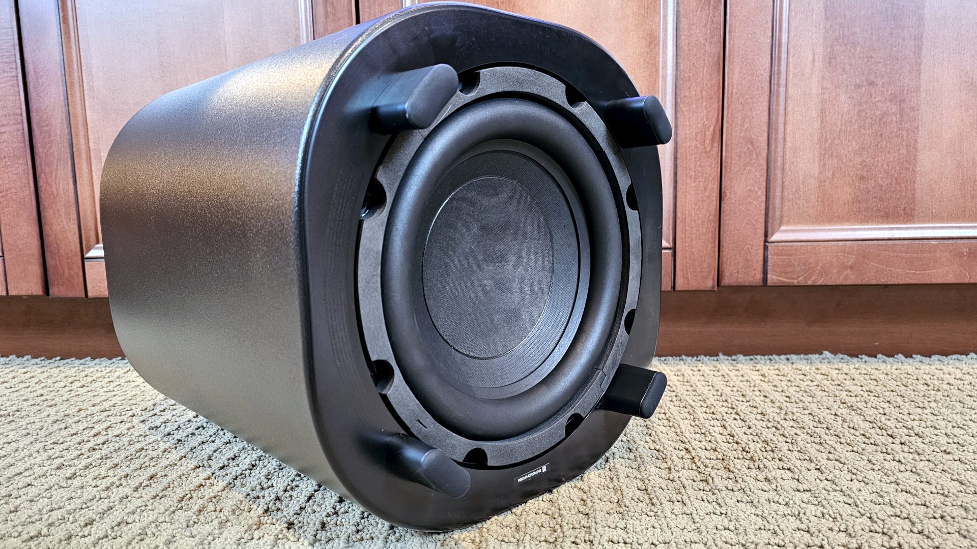 Сложнее быть в восторге от комплектного беспроводного сабвуфера. При высоте 15 дюймов (38 см) и почти 13-дюймовом (33 см) квадратном основании он большой, и это затрудняет его размещение. Возможно, вам удастся поставить что-то на его плоскую верхнюю поверхность — одна из наших кошек решила, что это идеальное место для сна, и ее удивительно не беспокоили низкочастотные вибрации, что, я полагаю, является своеобразным свидетельством способности корпуса гасить вибрации.
