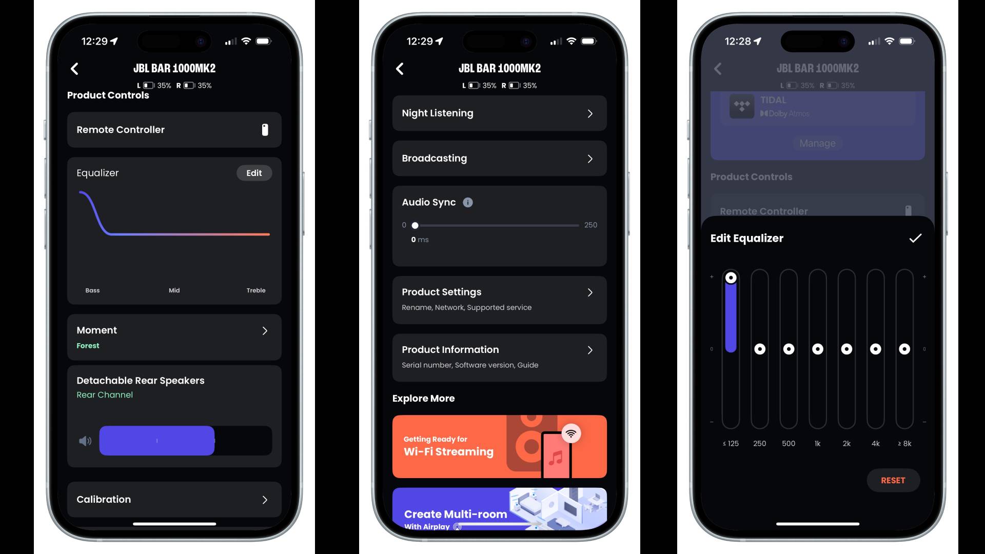 Вы можете сделать их немного тише или громче, используя три настройки заднего канала в приложении JBL One: низкий, средний и высокий.