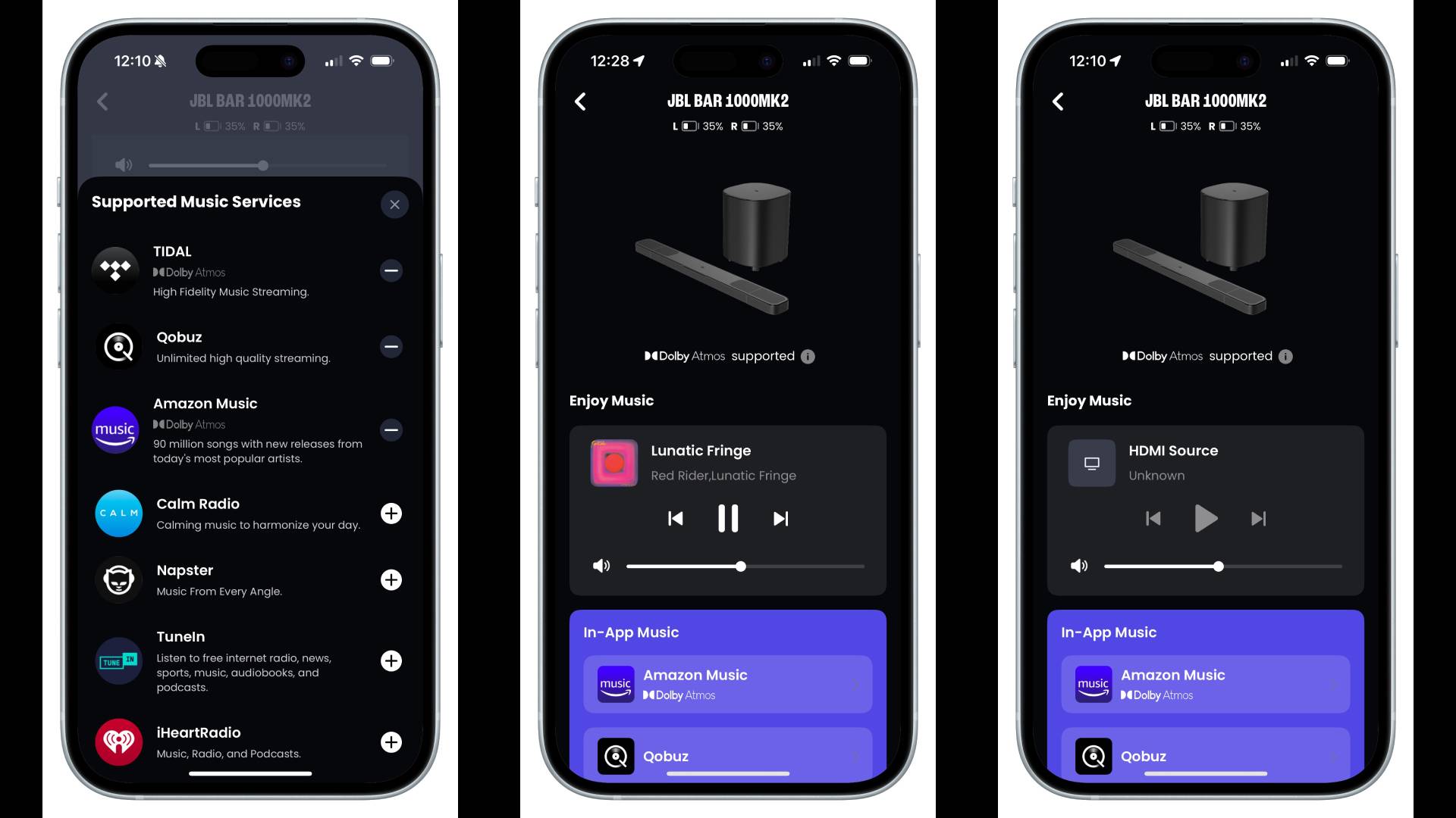Благодаря Bluetooth и Wi-Fi, а также Apple AirPlay 2, Google Cast, Tidal Connect и Spotify Connect, вы можете транслировать практически любую музыку на Bar 1000MK2. Более того, JBL позволяет нативно стримить сервисы вроде Tidal и Amazon Music из приложения JBL One, обеспечивая совместимость с треками Dolby Atmos Music (при их наличии). Давним поклонникам JBL следует знать, что в отличие от предыдущих саундбаров JBL, Bar 1000MK2 не совместим с Amazon Alexa для голосового управления или мультирум-аудио.