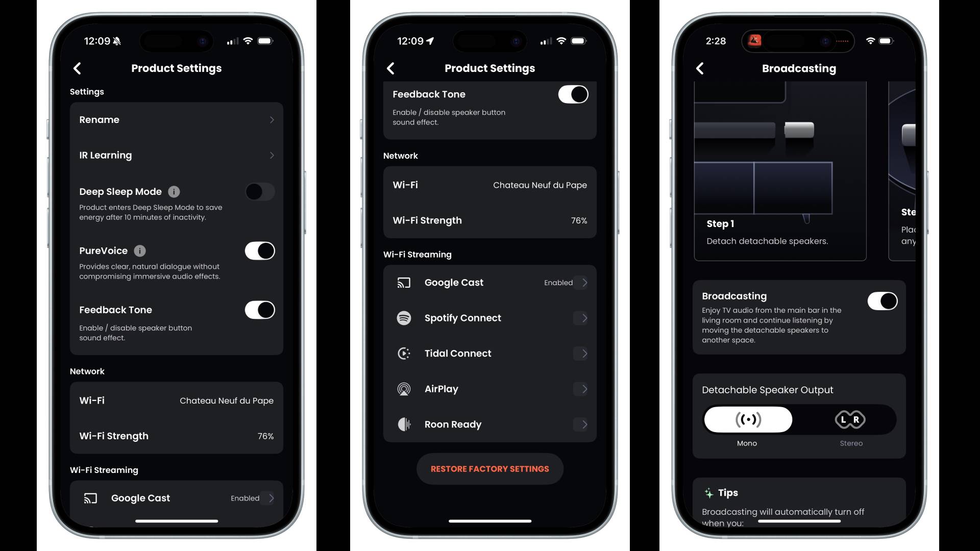 В большинстве случаев приложение вам не понадобится после первоначальной настройки. Благодаря встроенному дисплею большинство задач легко выполняются с помощью пульта. Исключения составляют изменение настроек эквалайзера и переключение на ночной режим или режим трансляции. Вам не нужно приложение для калибровки помещения для беспроводных тыловых колонок, но это проще сделать через него, чем с помощью пульта и встроенного дисплея.