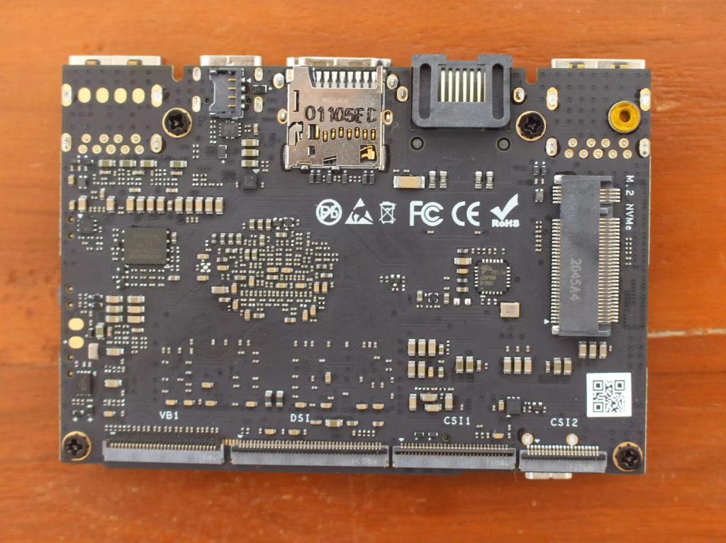 На противоположном краю платы находится 40-контактный GPIO. Перевернув плату, мы видим два разъема для камеры MIPI-CSI, дисплей MIPI, разъем для сенсорного экрана и высокоскоростной интерфейс V-by-One для промышленного применения.