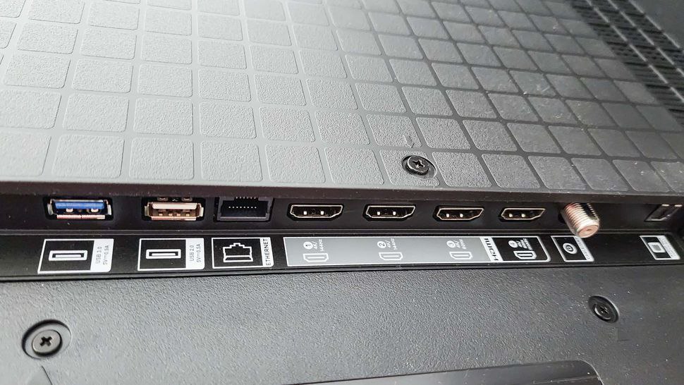 Кабель питания подключается к левой стороне телевизора. Все остальные порты расположены справа: два USB, Ethernet, четыре HDMI, коаксиальный кабель и оптический аудиовыход S/PDIF. Два порта HDMI соответствуют более новому и мощному стандарту HDMI 2.1 с частотой обновления до 144 Гц; два других порта — это HDMI 2.0 с частотой обновления до 60 Гц.