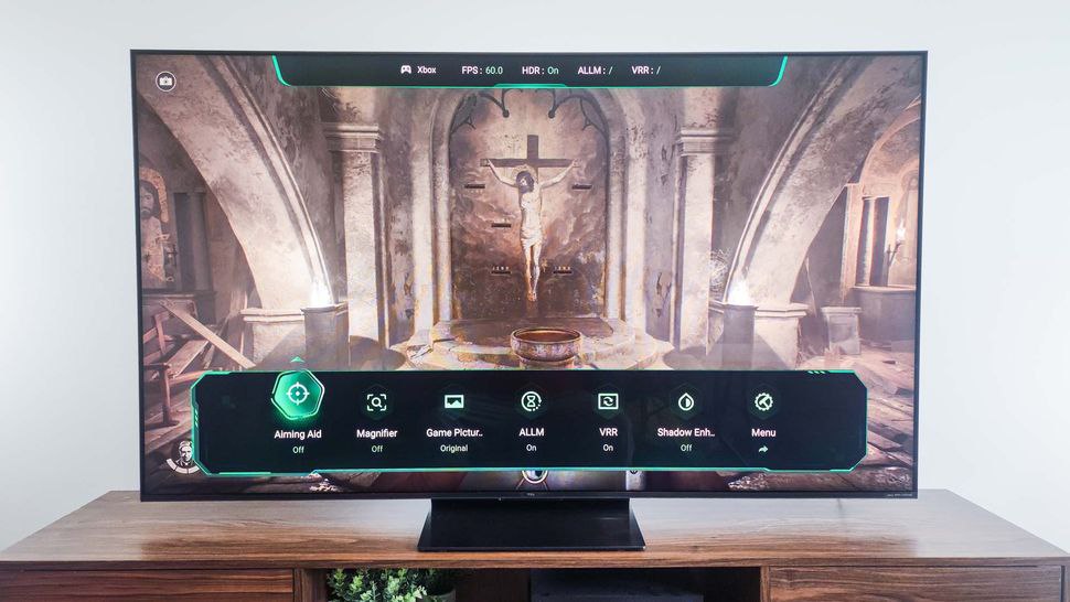 Игровая производительность телевизора хорошая, но не выдающаяся: с помощью моего тестера задержки ввода Leo Bodnar 4K я измерил задержку ввода в 13,1 мс — чуть выше нашего порога в 10 мс для выдающейся игровой производительности. Важной особенностью является всплывающая игровая панель, состоящая из двух частей, которую можно активировать в режиме «Мастер игры». Как и аналогичные панели на телевизорах других производителей, эта панель содержит много информации и предоставляет доступ к полезным игровым настройкам.
