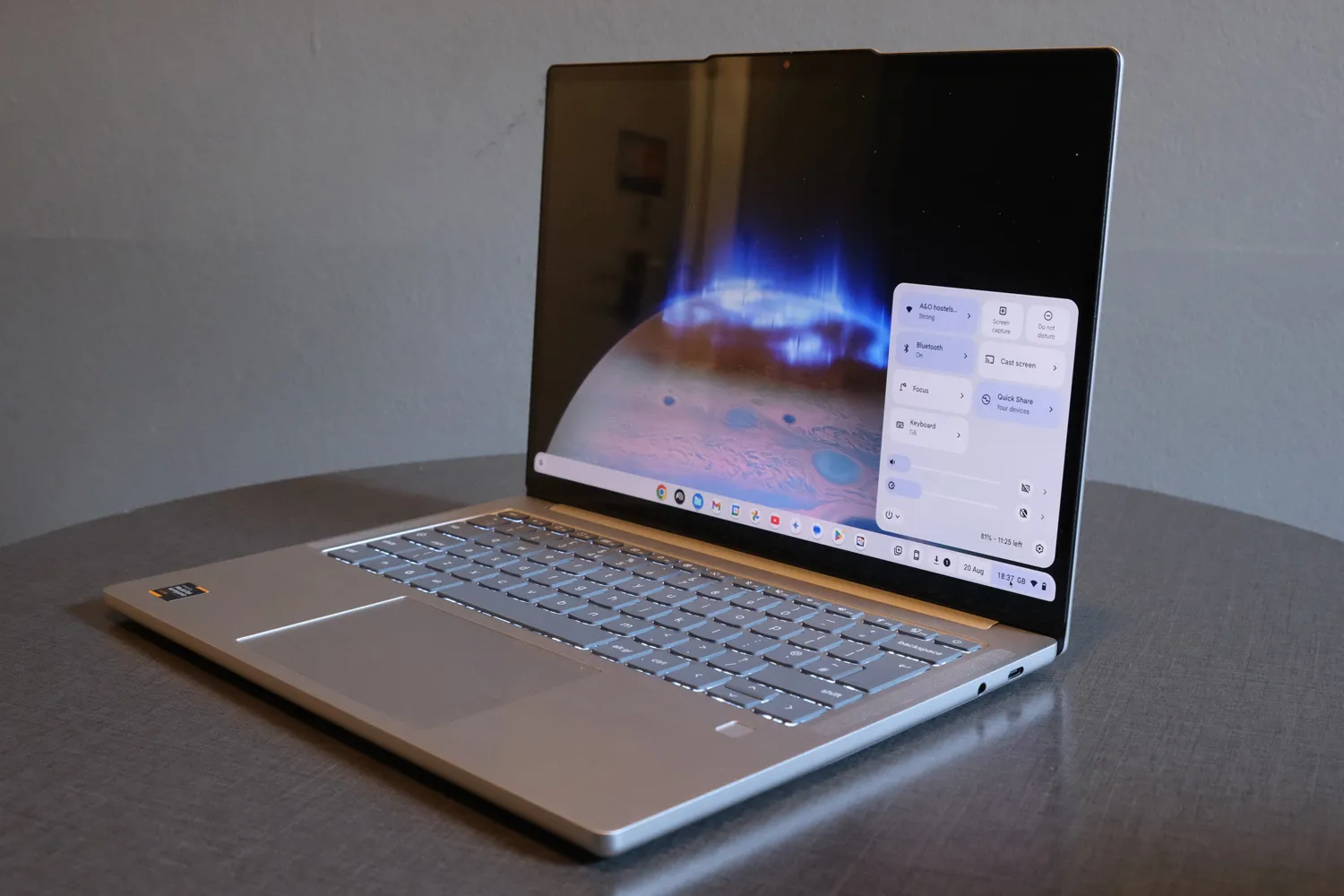 Приподнимите жёсткую крышку (чтобы открыть Lenovo Chromebook Plus 14, действительно нужны обе руки), и перед вами откроется великолепный 35,6 см OLED-дисплей Lenovo Chromebook Plus 14. Он имеет такое же разрешение 1920×1200, как и Samsung Galaxy Chromebook Plus, но втиснут в панель меньшего размера, поэтому изображение выглядит более чётким.