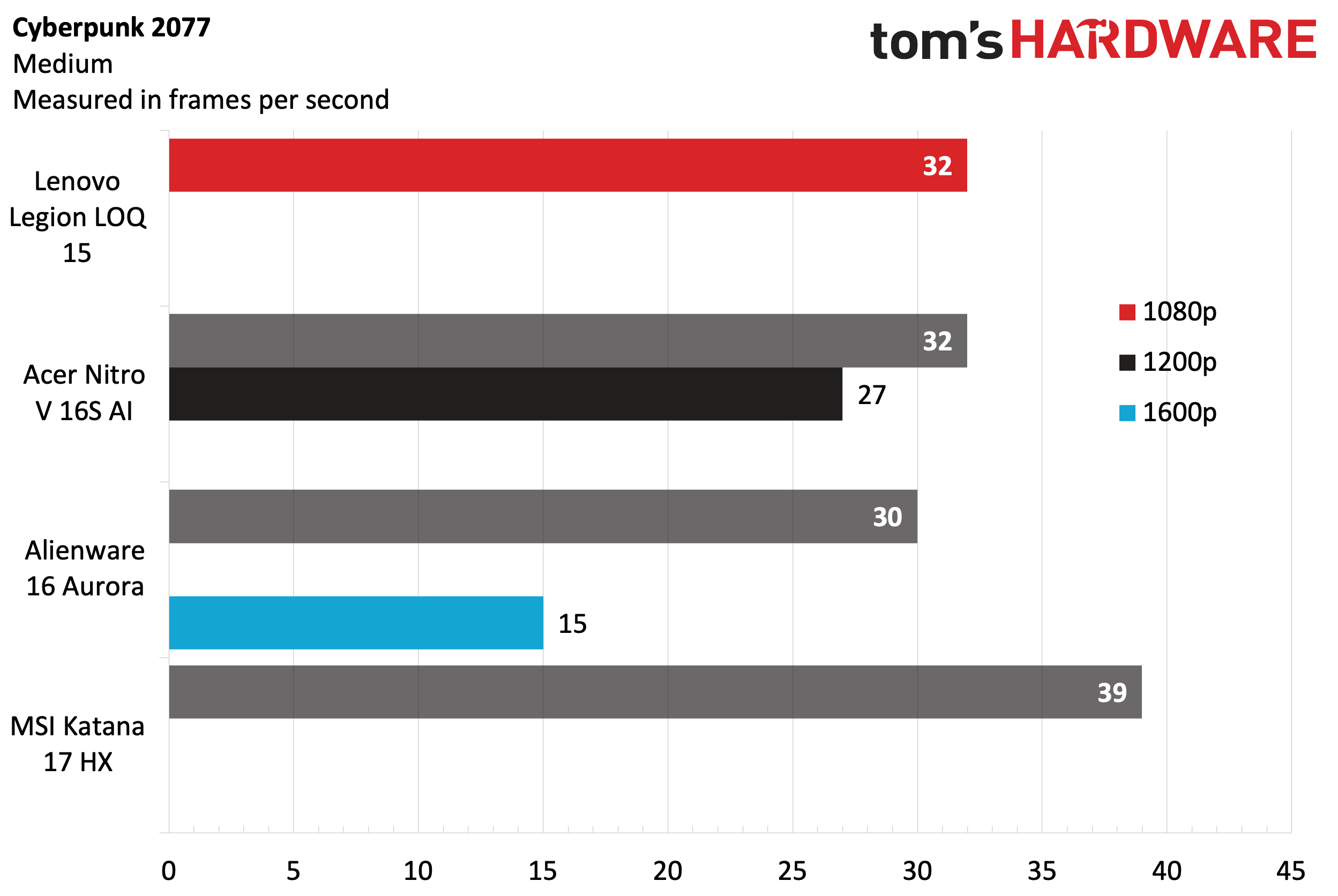 Аналогичная ситуация наблюдалась и с Cyberpunk 2077 (средние настройки): Legion LOQ 15 показала результат 32 FPS на уровне Nitro V 16S AI при разрешении 1080p, лишь немного опередив 16 Aurora, которая выдала 30 FPS. Katana 17 HX опередила всех, показав 39 FPS при разрешении 1080p.