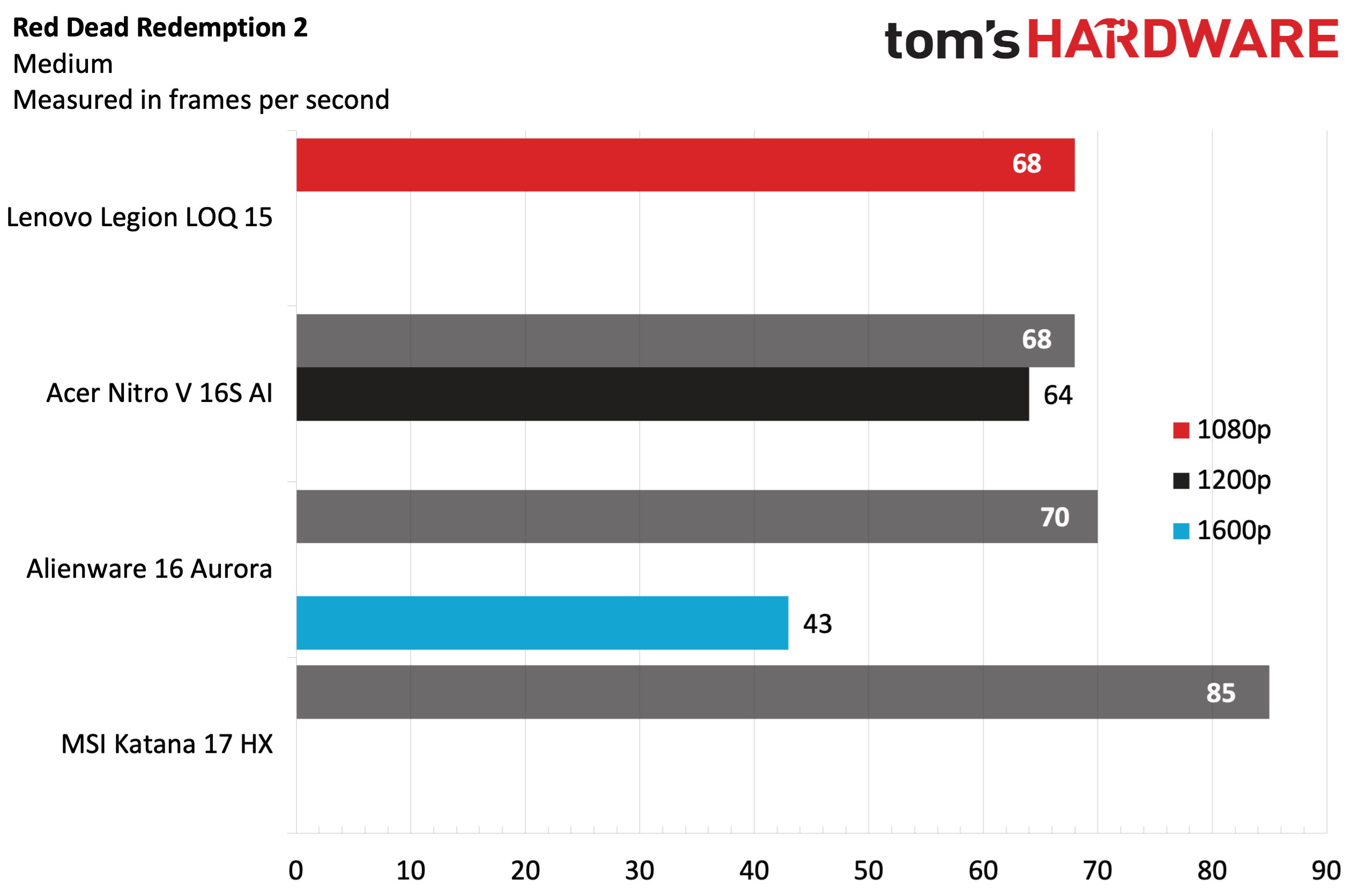 В бенчмарке Red Dead Redemption 2 (средние настройки) три ноутбука с видеокартами RTX 5060 показали очень близкие результаты: Legion LOQ 15 и Nitro V 16S AI набрали по 68 FPS. 16 Aurora немного опередила остальных с 70 FPS, а Katana 17 HX значительно опередила их, показав 85 FPS.