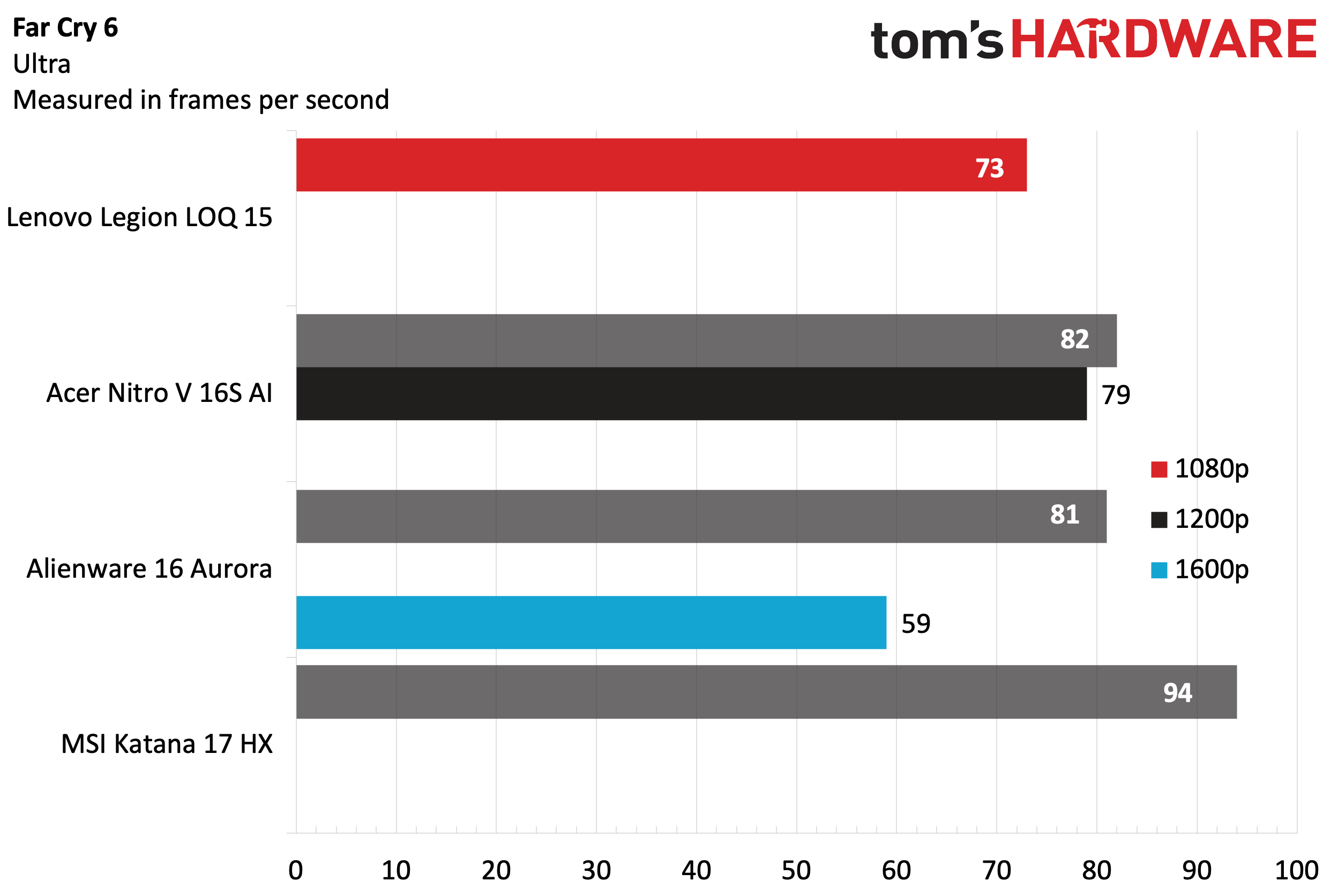 В бенчмарке Far Cry 6 (на ультра-настройках) ситуация изменилась: Legion LOQ 15 значительно опередила конкурентов. Она показала всего 73 FPS при разрешении 1080p, в то время как Nitro V 16S AI и 16 Aurora выдали 82 и 81 FPS соответственно. Katana 17 HX снова продемонстрировала свои графические возможности, достигнув 94 FPS при разрешении 1080p.