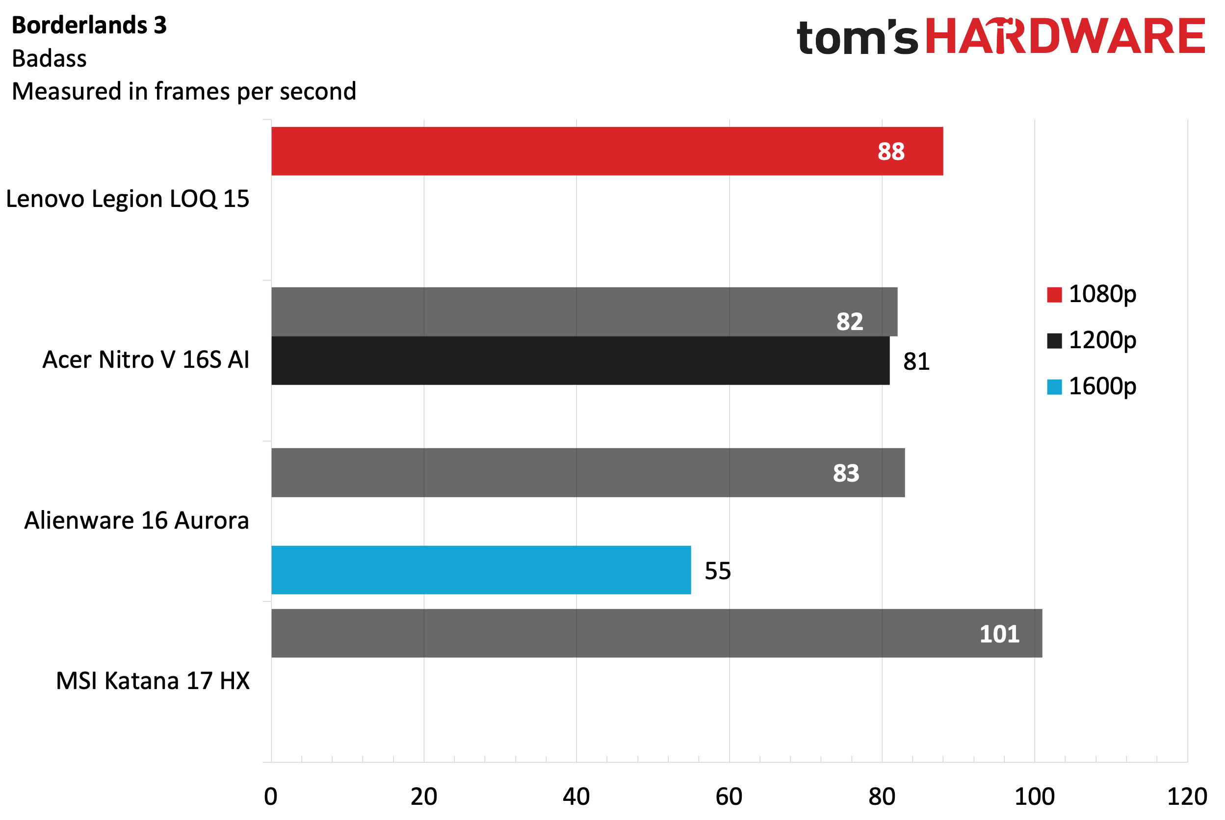 Наконец, Legion LOQ 15 показала себя с лучшей стороны в бенчмарке Borderlands 3 (настройки Badass), достигнув 88 FPS по сравнению с 82 FPS у Nitro V 16S AI и 83 FPS у 16 Aurora. Katana 17 HX снова продемонстрировала мощь своей RTX 5070, достигнув 101 FPS при разрешении 1080p.