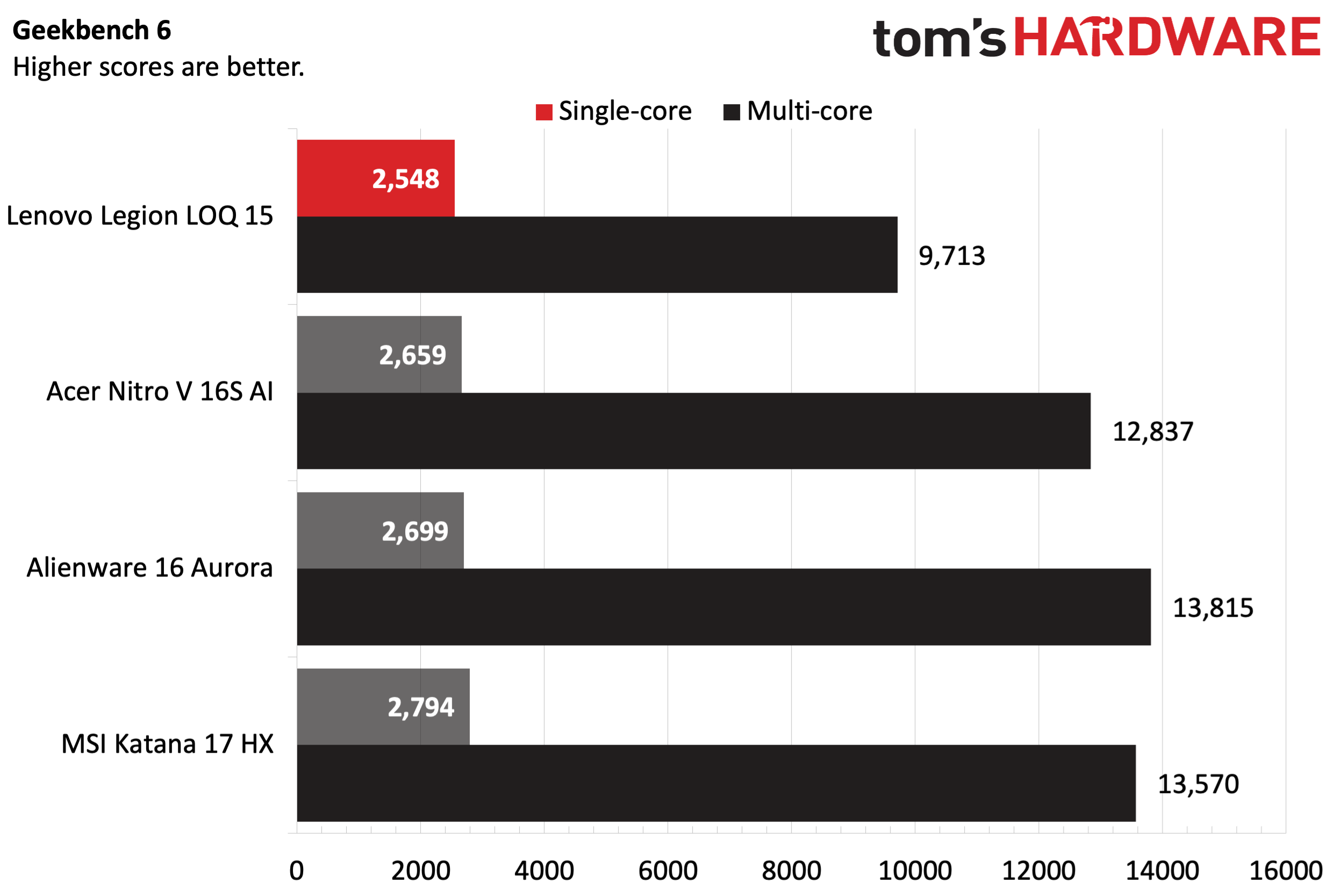 Ноутбук Legion LOQ 15 не смог в полной мере конкурировать с остальными моделями в Geekbench 6. Хотя его результат в одноядерном тесте (2548 баллов) был примерно таким же, как у остальных ноутбуков, он значительно отставал в многоядерном тесте (9713 баллов). Для сравнения, ближайший конкурент, Acer Nitro V 16S AI (Ryzen 7 260), набрал 12 837 баллов в многоядерном тесте, а 16-дюймовый Aurora лидировал с 13 815 баллами (Core i7-240H). И Ryzen 7 250, и Ryzen 7 260 — это 8-ядерные/16-поточные процессоры с тактовой частотой в режиме Boost 5,1 ГГц, но у последнего более высокий максимальный настраиваемый TDP (54 Вт против 30 Вт).
