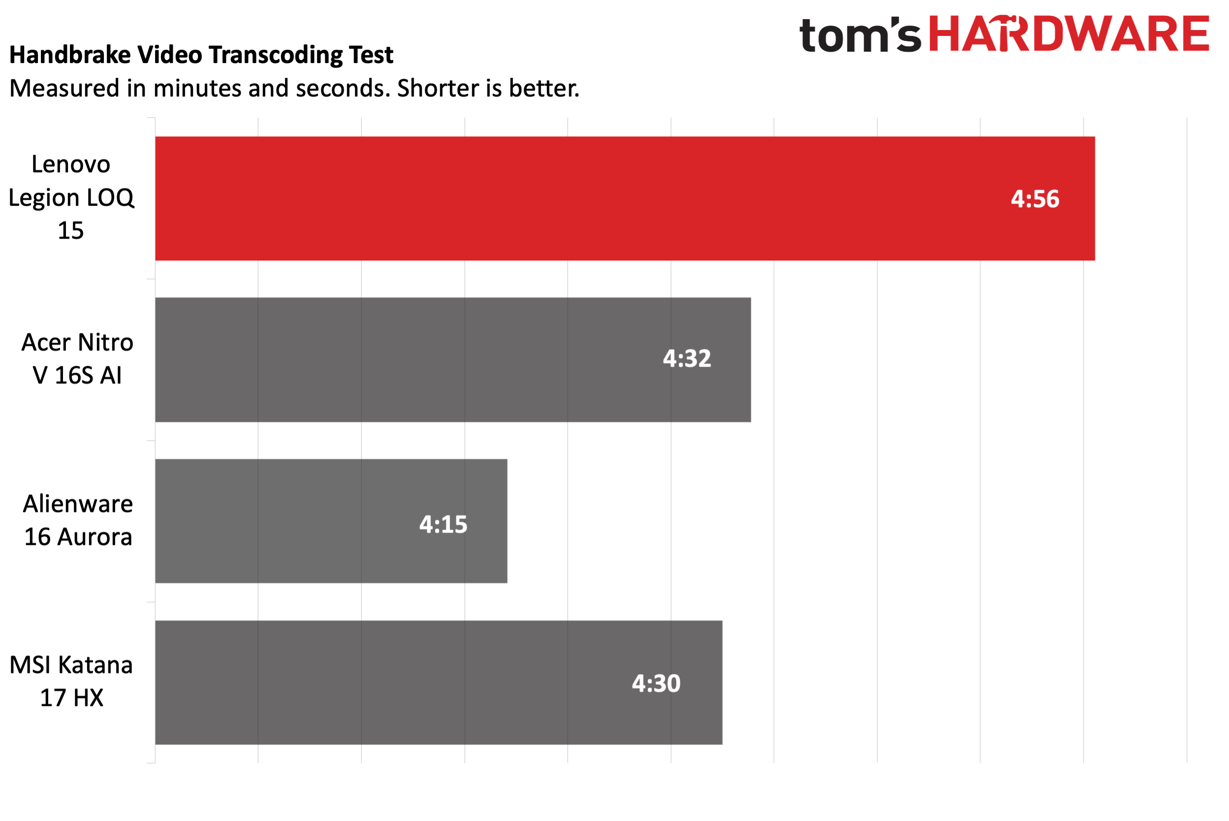 В нашем тесте Handbrake, где мы перекодируем большой видеофайл 4K в 1080p, Legion показал относительно низкие результаты. Legion LOQ 15 потребовалось 4:56 для выполнения задачи, по сравнению с 4:32 у занявшего третье место Nitro V 16S AI (использующего Ryzen 7 260). 16 Aurora лидировала среди всех участников с результатом 4:15.