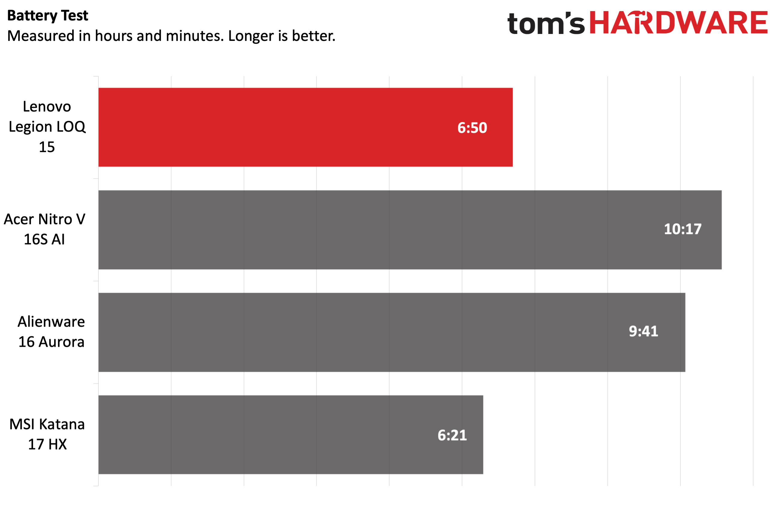 Ноутбук Legion LOQ 15 ни в коем случае не является чемпионом по времени автономной работы, о чем свидетельствует сравнение его характеристик с конкурентами. В ходе нашего теста батареи, включавшего просмотр веб-страниц, потоковую передачу видео по Wi-Fi и проведение тестов OpenGL при яркости экрана 150 нит, наш тестовый образец проработал всего 6 часов 50 минут. Только Katana 17 HX показала меньшее время работы (6:21), а Nitro V 16S AI обеспечила почти на три с половиной часа больше времени автономной работы (10:17) по сравнению с Legion LOQ 15.
