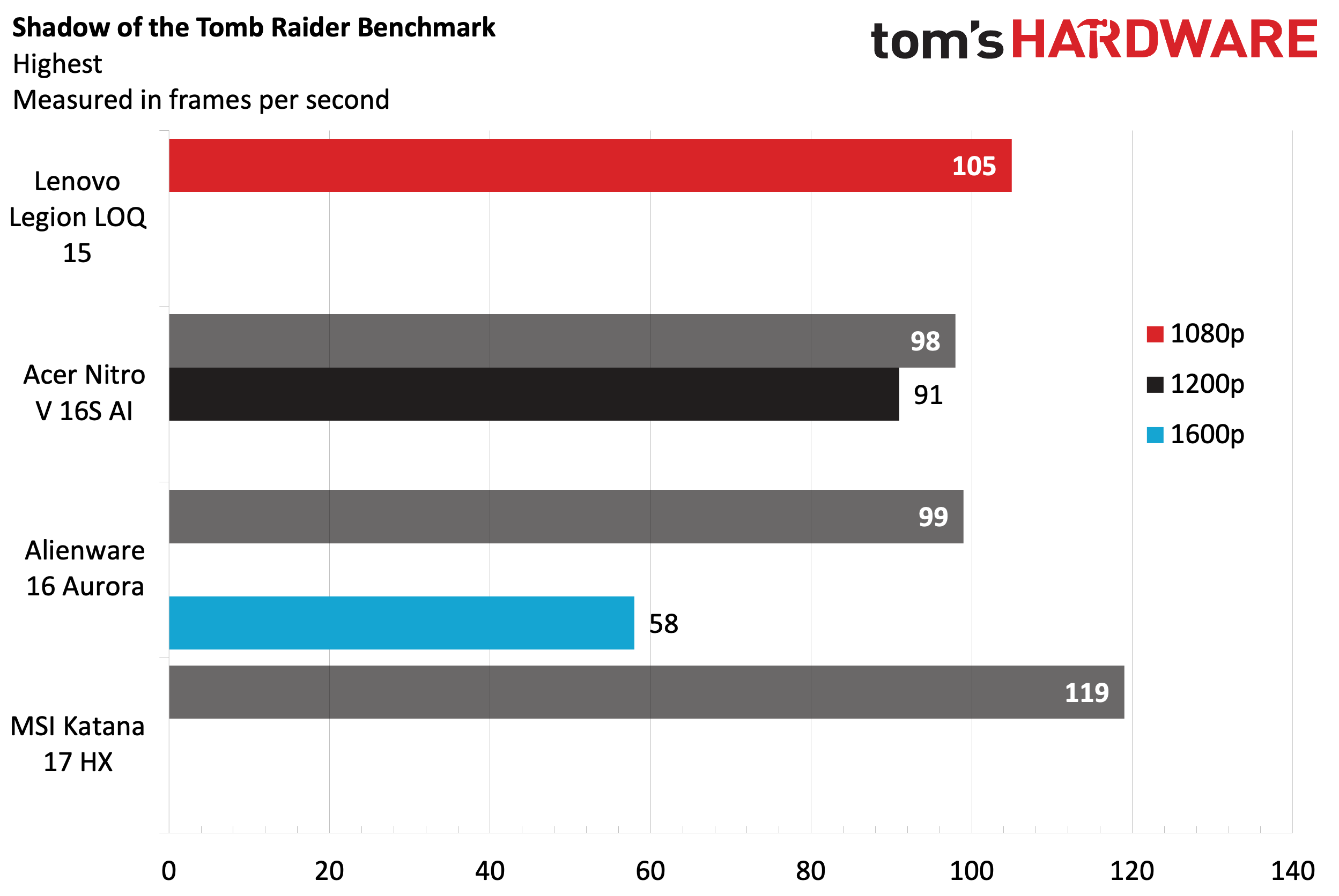 Начав с бенчмарка Shadow of the Tomb Raider (максимальные настройки), Legion LOQ 15 показала отличные результаты, выдав 105 кадров в секунду (FPS) при разрешении 1080p. Этого оказалось достаточно для второго места, немного опередив Nitro V 16S AI (RTX 5060, 85 Вт TGP) и 16 Aurora (RTX 5060, 80 Вт TGP). Вполне ожидаемо, что Katana 17 HX стала лидером в этой группе (RTX 5070, 115 Вт TGP) с результатом 119 FPS.