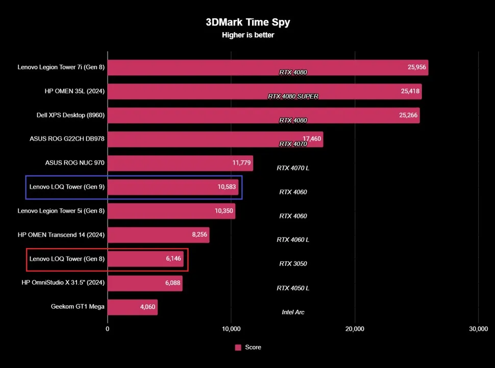 Я 15 раз подряд запускал LOQ Tower в тесте Time Spy от 3DMark, и стабильность частоты кадров составила 98,1 %. Это то, что я бы назвал «хорошим» результатом — не выдающимся, но и не вызывающим беспокойства.