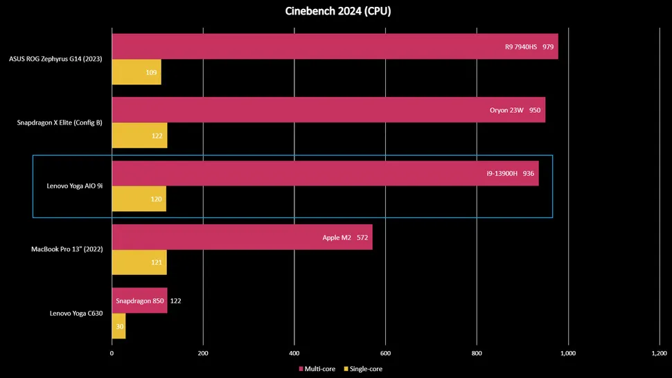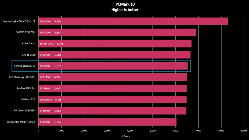 В Geekbench ситуация аналогичная: Lenovo Yoga AiO 9i не уступает Razer Blade 15 и Surface Laptop Studio 2, набрав 2822 балла в одноядерном тесте и 13 948 баллов в многоядерном. В нашем тесте PCMark 10 процессор Intel Core i9-13900H от Lenovo AiO смог сравняться только с Intel Core i7-13800H.