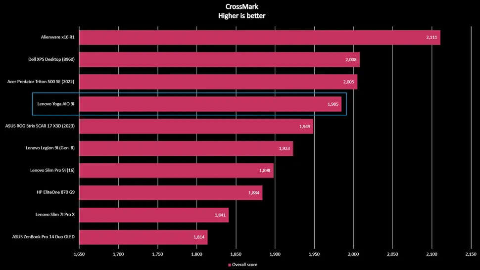 В наших тестах Cinebench 2024 процессор Intel Core i9 не уступает AMD Ryzen 9 7940HS как в многоядерных, так и в одноядерных тестах. В CrossMark Lenovo Yoga AiO 9i превосходит ASUS ROG Strix 17 и почти не уступает Dell XPS Desktop (8960), разница между ними составляет всего несколько баллов.