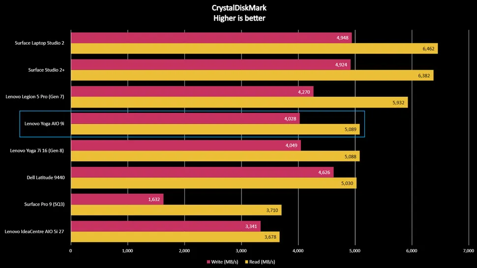 Производительность твердотельного накопителя также хорошая, хотя и не самая высокая. Мой тестовый образец был оснащен накопителем емкостью 1 ТБ со скоростью записи 4028 МБ/с и скоростью чтения 5089 МБ/с. Это сопоставимо с Lenovo Yoga 7i Gen 8, но уступает ближайшему конкуренту с интерфейсом AiO, Surface Studio 2+, у которого скорость чтения составляет 4924 МБ/с, а скорость записи — 6382 МБ/с.