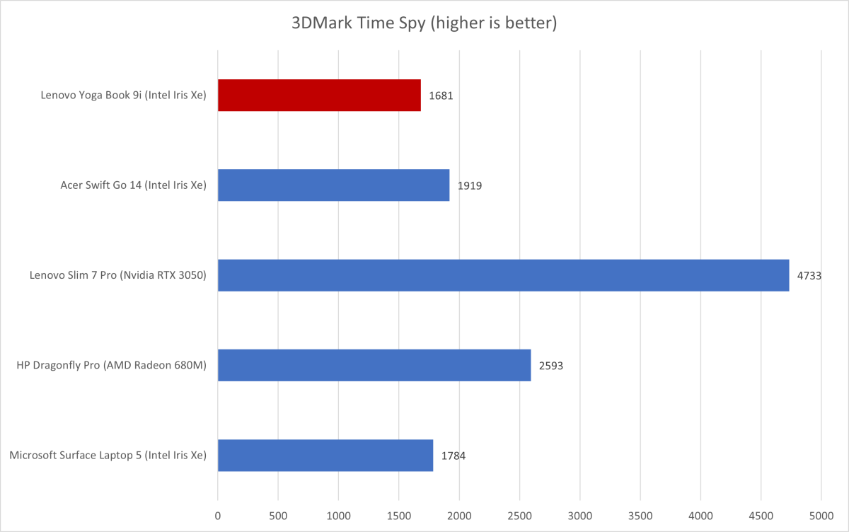 3DMark Time Spy (выше), графический тест, также показывает неутешительные результаты. Yoga Book 9i снова оказался позади конкурентов, включая ноутбуки, в которых также используется графика Intel Iris Xe.