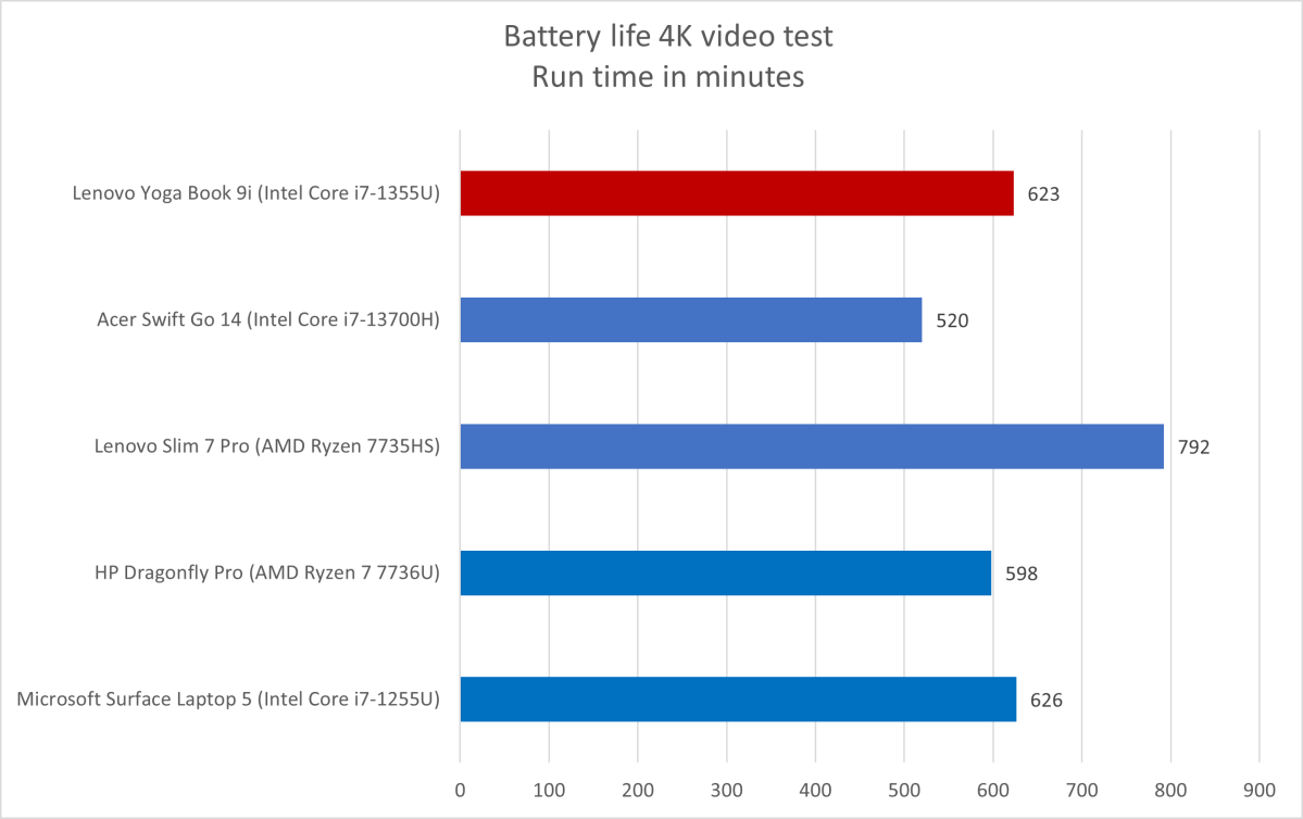 Мы записали 10 часов и 23 минуты работы в нашем стандартном тесте воспроизведения видео 4K, результаты показаны в минутах ниже. Это сравнимо с ноутбуками и 2-в-1 аналогичного размера и цены: Lenovo Slim 7 Pro проработал на час больше, а HP Dragonfly Pro отстает на полчаса.