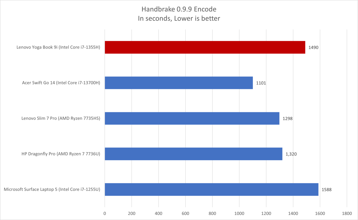 Результаты Handbrake (выше) более обнадеживающие, но устройство по-прежнему отстает от многих ноутбуков аналогичного размера. Очевидно, что Yoga Book 9i настроен больше на портативность, чем на производительность.