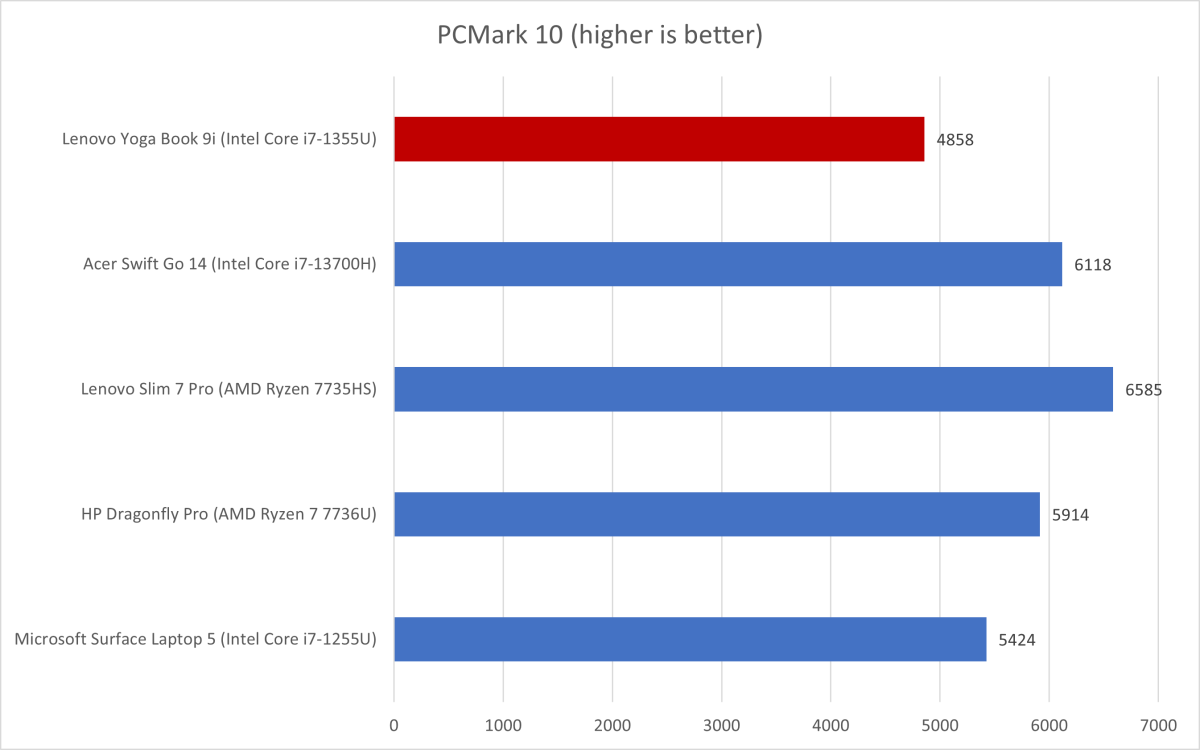 PCMark 10 (выше) рисует неутешительную картину производительности Yoga Book 9i. Его суммарный результат ниже, чем у многих последних ноутбуков, включая Surface Laptop 5 несмотря на то, что в устройстве Microsoft используется более старый процессор Intel Core i7-1255U.
