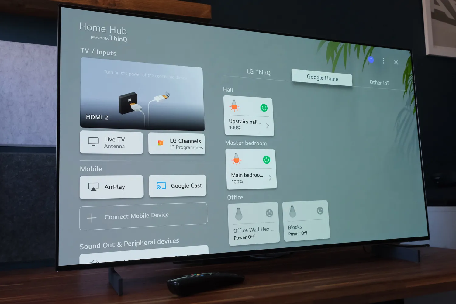В остальном подключение достаточно хорошее: три слота USB-A 2.0, цифровой оптический аудиовыход, Ethernet, 3,5-миллиметровый разъём для наушников и пара антенных разъёмов. Wi-Fi 6 позволяет подключаться без проводов, а Apple AirPlay обеспечивает беспроводную передачу контента. Система «умный дом» LG ThinQ хорошо интегрирована и может работать с устройствами IoT с поддержкой Matter.