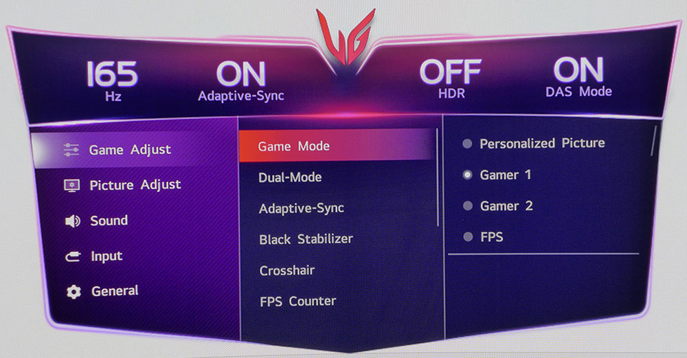 Game Adjust — это первое открывающееся меню, которое начинается с выбора режимов изображения для 45GX950A. Всего их 13, включая sRGB, эмуляцию HDR и две калибровочные памяти, которые работают с приложением LG Calibration Studio. Персонализированное изображение — это ещё одна память, которая подключается к приложению LG Switch.