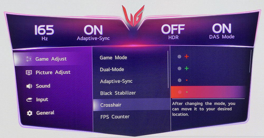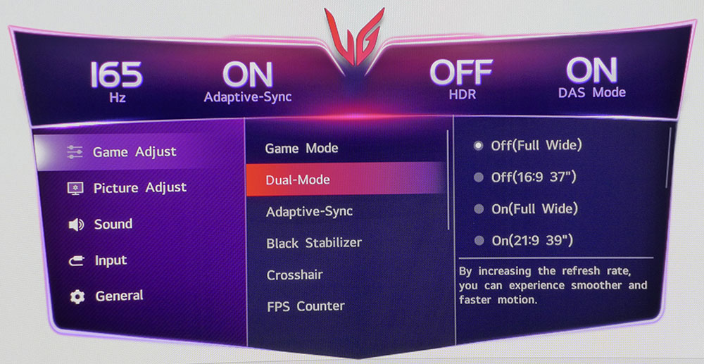 Dual-Mode — это переключатель частоты обновления/разрешения, который позволяет выбрать 5120×2160 при 165 Гц или 2560×1080 при 330 Гц. Вы также можете изменить соотношение сторон на 16:9 или 21:9/39”, чтобы играть в игры, которые искажают изображение в полноэкранном режиме. Переключение происходило без задержек, мне не нужно было заранее настраивать его в панели управления Nvidia. Мы с LG рекомендуем вам выполнить переключение перед запуском игры. Дополнительные игровые функции включают в себя точки прицеливания и счетчик частоты кадров.